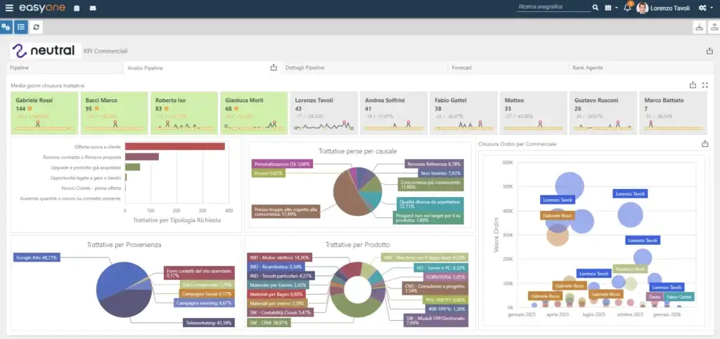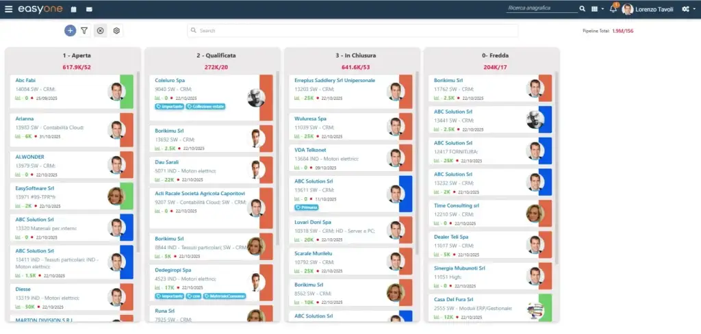 Con la pipeline visiva di Easyone hai il controllo completo di ogni opportunita, dal primo contatto alla firma. Trascina le trattative tra le fasi, assegna attivita al team e monitora i progressi in tempo reale.